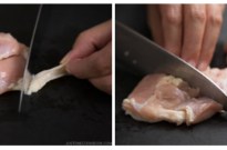 - Remove and discard extra fat and skin, and cut each skin-on chicken thigh into 5 to 6 pieces, about 1 ½ inch (4 cm) pieces.