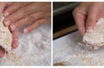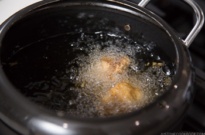 - When the oil is hot, drain the chicken well from the marinade and coat each piece with the corn/potato starch. Make sure the chicken is all covered by the starch so when you put the chicken into the oil, it won’t splatter.