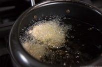 In the tray or bowl, prepare corn starch/potato starch. In a deep fry pot, heat the oil to 340 ºF (170 ºC). Use a thermometer or wooden chopsticks to see if the oil is ready (See How to Deep Fry Foods). Tip: You put a chopstick in the oil and when you see the bubbles around it, it’s ready!