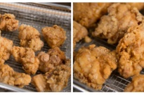- Once the chicken is all deep fried for the first round, use a fine mesh sieve to pick up crumbs to keep the oil clean. If you don’t do this step, the crumbs get darker and then the oil gets darker. Increase the heat and bring the oil to 350 ºF (180 ºC). Deep fry the chicken for the second time for 45 seconds or until crispy and golden brown.