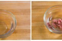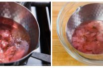 - Gently squeeze water out of the salt pickled cherry blossoms and add them in the saucepan. Turn off the heat.