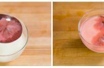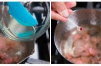 - Add the gelatin and give a quick mix and then add a tiny bit of red food coloring. If you want nice light pink color, add only tiny bit. You can always add a little more if you want it to be a darker red.