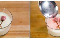 - If you want the cherry blossoms to look bloomed, scoop the flower with the liquid mixture in a big spoon and pour onto top of the milk pudding.