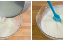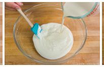 - Slowly add the milk mixture to the yogurt mixture while you stir.