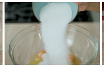 In a large mixing bowl, whisk together 4 egg yolks and sugar (80 g, ⅓ cup + 1 Tbsp) until pale and creamy.