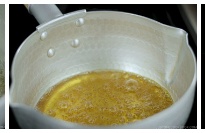 - Once the mixture comes to a boil, about 4 minutes, lower the heat to simmer. Gently swirl and tilt the pot around the heat (don’t stir it) to distribute the color evenly until it becomes amber (like darker honey), about 6 minutes.