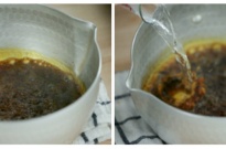 - Once it reaches the desired amber color, immediately remove the pot from heat to a cold damp towel and add 2 Tbsp boiling water. It will create a huge splash so please be careful. You can shield with a lid or wear oven mitts to protect your hands. Stir the saucepan to mix together. This will slightly thin out the caramel sauce and ensure it doesn’t become too thick in the ramekins.