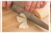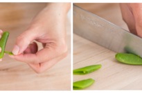 - Pull off the tough string that runs along the length of the pod. Then cut in half diagonally.