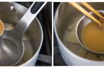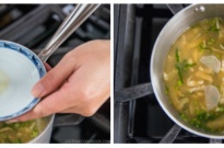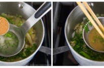 - Make sure the soup is hot at this stage as we will not reheat. Add miso into the ladle, NOT into the soup. Use a pair of chopsticks (or fork) to dissolve miso completely in the ladle before releasing into the soup. ALWAYS taste the miso soup before adding more miso.