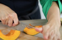 - Kabocha: Thinly slice the kabocha (cut in half if it’s too big). If the kabocha is too hard to cut, microwave for 30 seconds or more if it’s still hard.