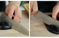 - Eggplant: Right before deep frying (otherwise it’ll change color), cut the eggplants in half and cut the skin side in criss-cross pattern. This creates a nice design and helps to absorb more flavors.