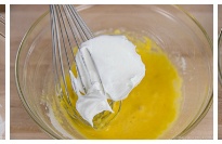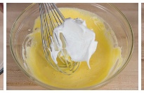 - Next, take half of the egg whites and add to the egg yolk mixture. Gently fold in without breaking the air bubbles in the egg whites.