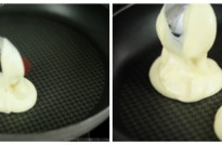 - Remember each pancake gets roughly 4 scoops of batter, so that’s total of 12 scoops for 3 pancakes. Now, scoop the batter and place on the frying pan. My recommendation is to use a small ladle (or a serving spoon that’s bigger than regular spoon) and make a tall pancake. Next, stack one more scoop to the first pancake. Then move on to the next two pancakes giving each 2 small scoops.