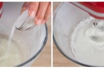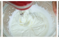 - When the egg whites turn frothy and pale white, gradually add in sugar. Continue to whip the egg whites.