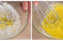 - Take 1/3 of egg whites and add into the egg yolk mixture. Whisk together (don’t worry too much about breaking air bubbles at this step).