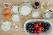 Place fresh cream on the pancakes and top with berries. Dust the pancake with confectioners’ sugar and drizzle with maple syrup. Enjoy!
