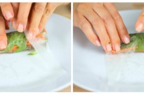 - Once all the food is prepared, bring water to boil in a kettle (or pot). Pour hot water in a large bowl. Working with 1 wrapper at a time, soak the wrapper in the hot water and rotate 2-3 times, about 10 seconds. The wrapper will still feel slightly stiff but don’t worry, it will become softer. Place it flat on a plate.