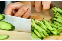 - Cut the cucumber diagonally into thin slices and then cut them into thin strips.
