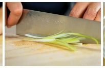 - Cut off the green part of the green onions and we will only use the white part. Cut the white part in half lengthwise and thinly slice into long strips. Soak in iced water to make them crisp and curl.